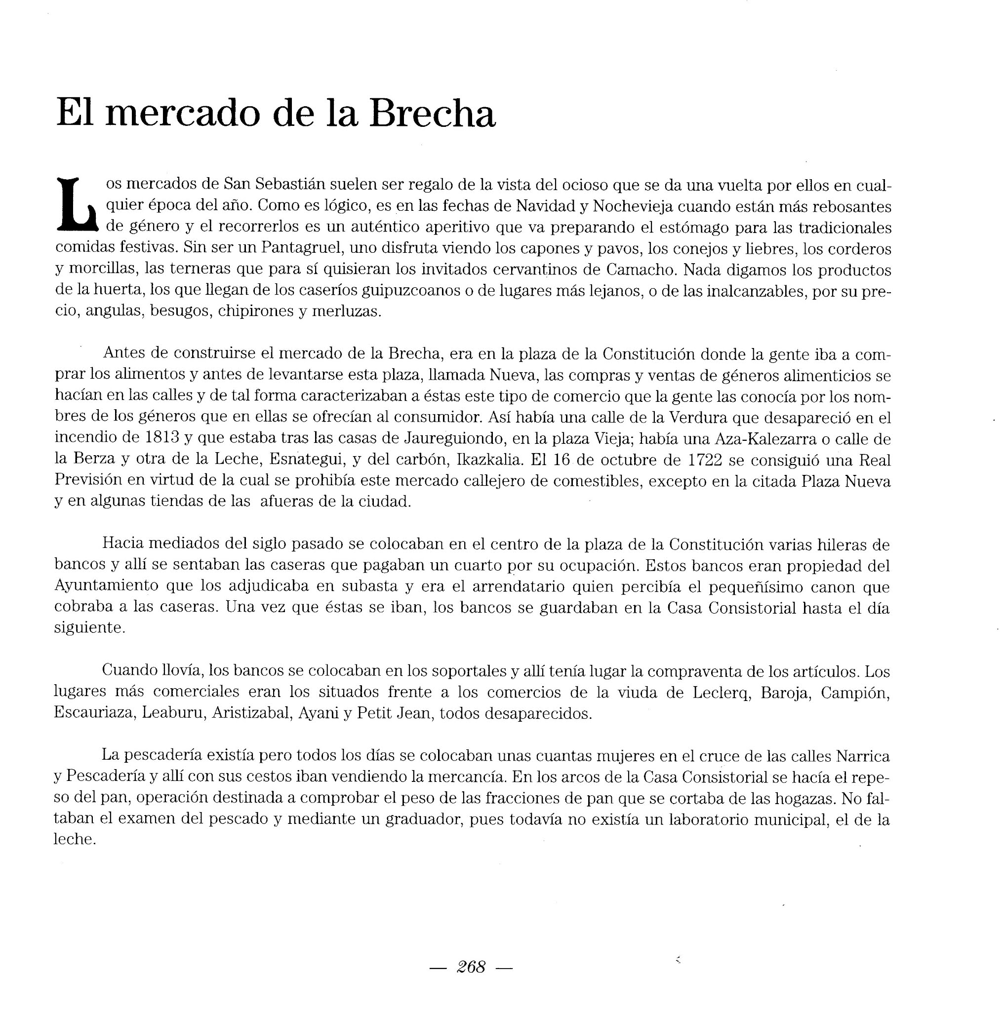 Antes de construirse el mercado de la Brecha, era en la plaza de la Constitución donde la gente iba a comprar los alimentos y antes de levantarse esta plaza, llamada Nueva, las compras y ventas de géneros alimenticios se hacían en las calles y de tal forma caracterizaban a éstas este tipo de comercio que la gente las conocía por los nombres de los géneros que en ellas se ofrecían al consumidor. Así había una calle de la Verdura que desapareció en el incendio de 1813 y que estaba tras las casas de Jaureguiondo, en la Plaza Vieja; había una Aza-Kalezarra o calle de la Berza, y otra de la Leche, Esnategui, y del carbón, Ikazkalia. El 16 de octubre de 1722 se consiguió una Real Previsión en virtud de la cual se prohibía este mercado callejero de comestibles, excepto en la citada Plaza Nueva y en algunas tiendas de las afueras de la ciudad.